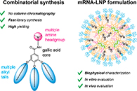 Abstract Lipid nanoparticles (LNPs), containing ionizable cationic lipids, have attracted widespread interest in recent years, particularly following their use as mRNA delivery systems for COVID-19 vaccines. Here, we report on the combinatorial synthesis of galloyl amidoamine-based ionizable lipids. Starting from methyl gallate, three alkyl tails were substituted onto the aromatic ring, and the carboxylic acid was transformed into an ionizable tertiary amine headgroup. Optimization of the synthetic protocol resulted in a scalable, chromatography-free procedure requiring as few as two transformation steps and yielding a library of 43 different lipids in high yield (>88%). By varying the ionizable amine headgroup and the length, saturation, and branching of the alkyl tails, we found that the length of the lipid tail significantly impacted solubility and mRNA encapsulation efficiency. Trialkyl lipids comprising unsaturated heptyl and octyl tails enabled the formulation of sub-150 nm LNPs with encapsulation efficiencies exceeding 85%. Benchmarking experiments against a commercial MC3 LNP formulation identified four lipids that enabled potent mRNA transfection in vitro. Moreover, in vivo studies in mice with selected LNP formulations indicated that three lipids performed on par with MC3 in terms of luciferase reporter-protein expression in the liver and spleen after intravenous administration.