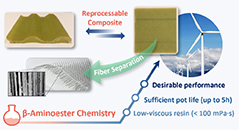 Abstract Wind turbine blades pose a major recycling challenge due to their complex composition of thermoset polymers embedded in fiber-reinforced composites. This study presents a cost-effective and scalable approach using covalent adaptable networks based on β-aminoester curing agents for epoxy resins, specifically tailored to meet the requirements of the wind turbine blade industry. The formulation offers low mixed viscosity (<100 mPa·s) and customizable pot life of up to more than 5 h and provides glass transition temperatures of above 75 °C and tensile stiffness exceeding 2.8 GPa. Furthermore, the successful reshaping of glass fiber-reinforced composites, produced by vacuum-assisted resin infusion, and the feasibility of chemically degrading the polymer matrix with acetic acid have been demonstrated. The herein-presented approach holds promise for advancing sustainable practices in wind energy infrastructure.